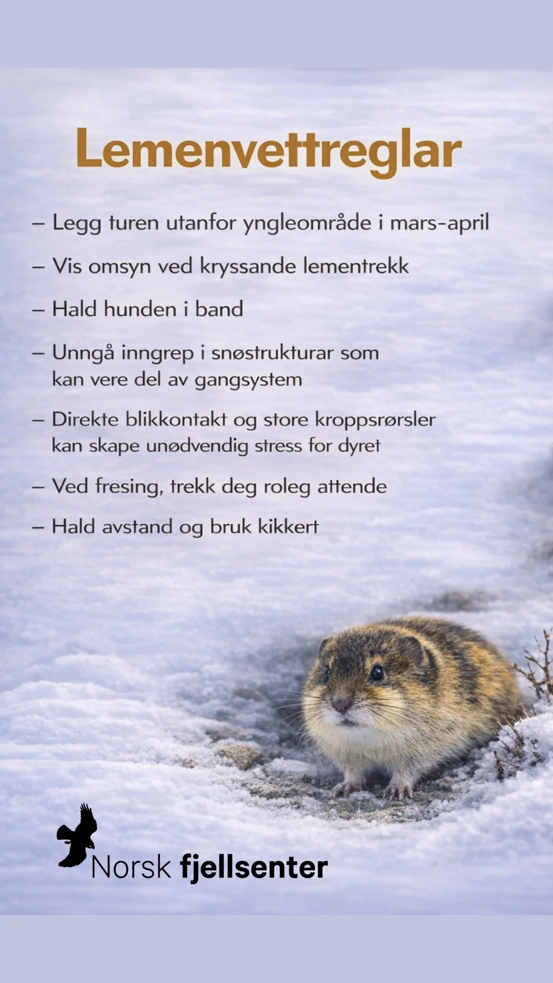 Vi skal ikkje grave gangar i snøen eller dyrke fôr til lemen. Likevel ligg det eit alvor i spøken: meir ustabile vintrar og nedising gjer livet vanskeleg for mange ville dyr. Våren er ei særleg sårbar tid, når kalving og hekking står for tur etter ein lang vinter. Vi oppmodar deg til å vise ekstra omsyn når du er ute i fjellet på denne tida.